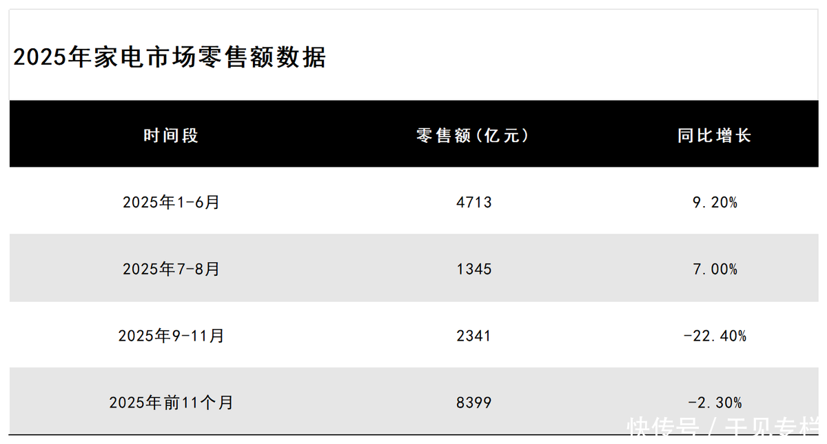 2025年,受家电补贴资金季度拨付节奏影响,国内家电市场销量呈现“前高后低”的鲜明特征。奥维云网数据显示,1-6月、7-8月、9-11月国内家电市场(不含3C产品)全渠道零售额同比增速分别为9.2%、7.0%、-22.4%,市场波动幅度显著。