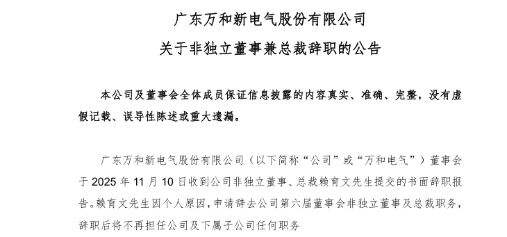2025年,万和电气高管变动频繁:7月,公司实际控制人之一卢楚鹏辞去副总裁职务;8月,赖育文被提名为非独立董事候选人,9月经股东大会表决通过,11月便骤然辞职。如此短暂的高管任期,在A股上市公司中实属罕见。