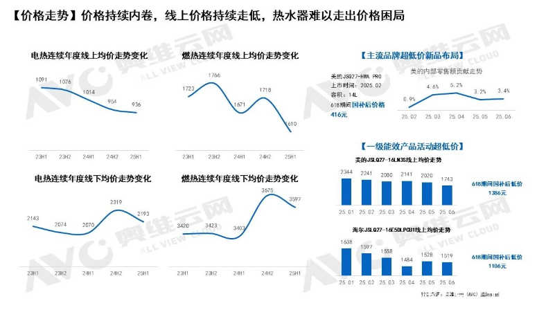 价格维度的分化同样突出,国补推动行业呈现“性价比内卷与高端化突围”并存的格局。2025年上半年,厨电全品类(含吸油烟机、燃气灶、集成灶等)整体均价同比下降5.8%至1627元,性价比赛道竞争白热化:618期间,主流品牌电热新品价格跌破500元,一级能效燃热产品逼近千元,低价内卷持续加剧。